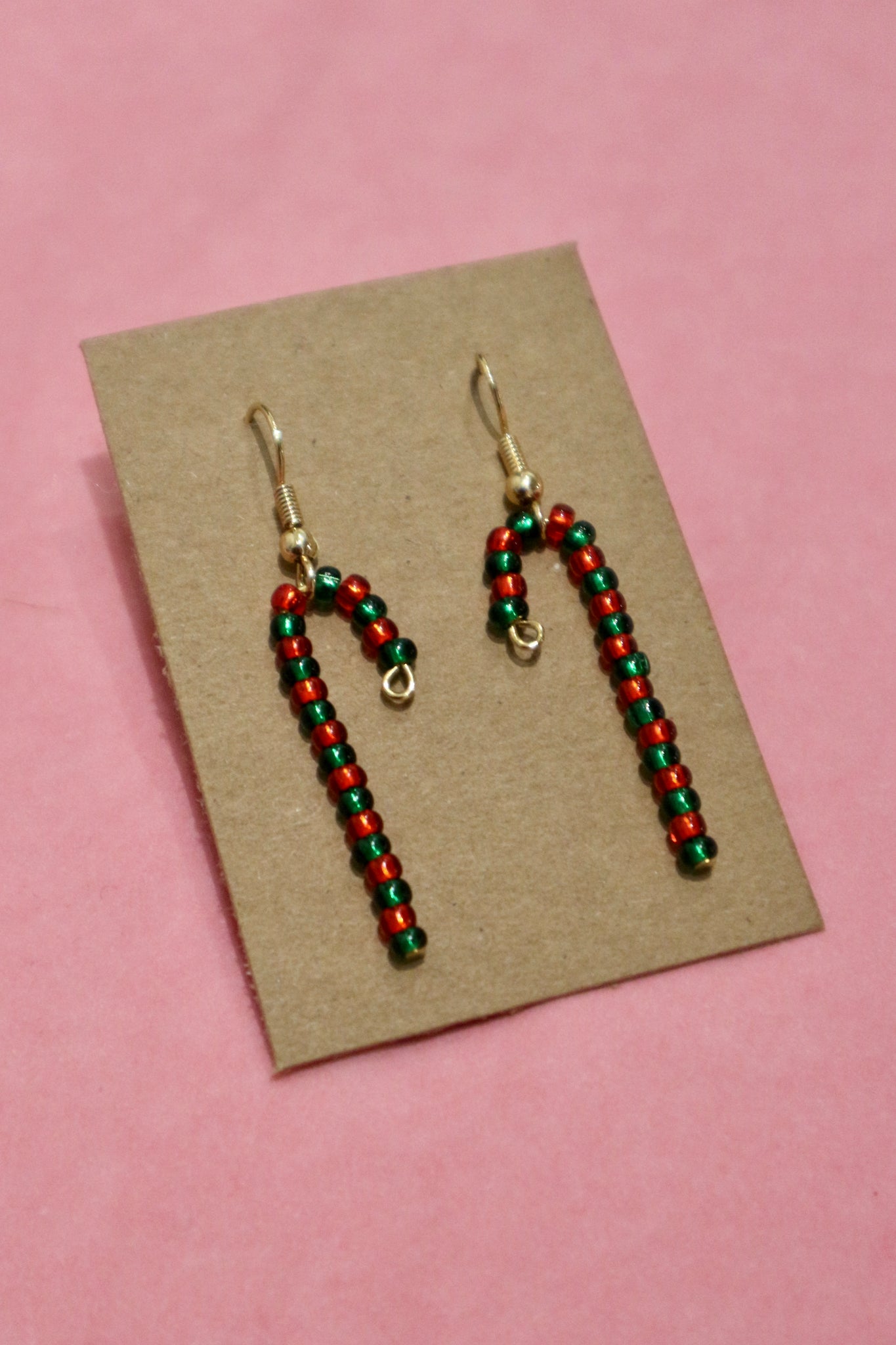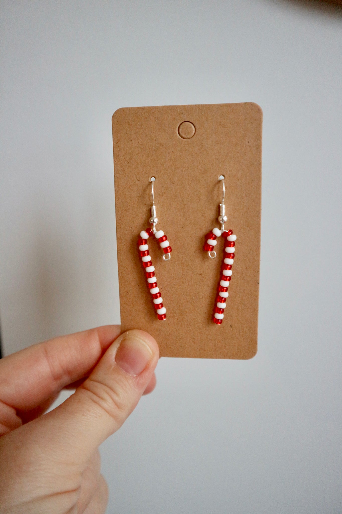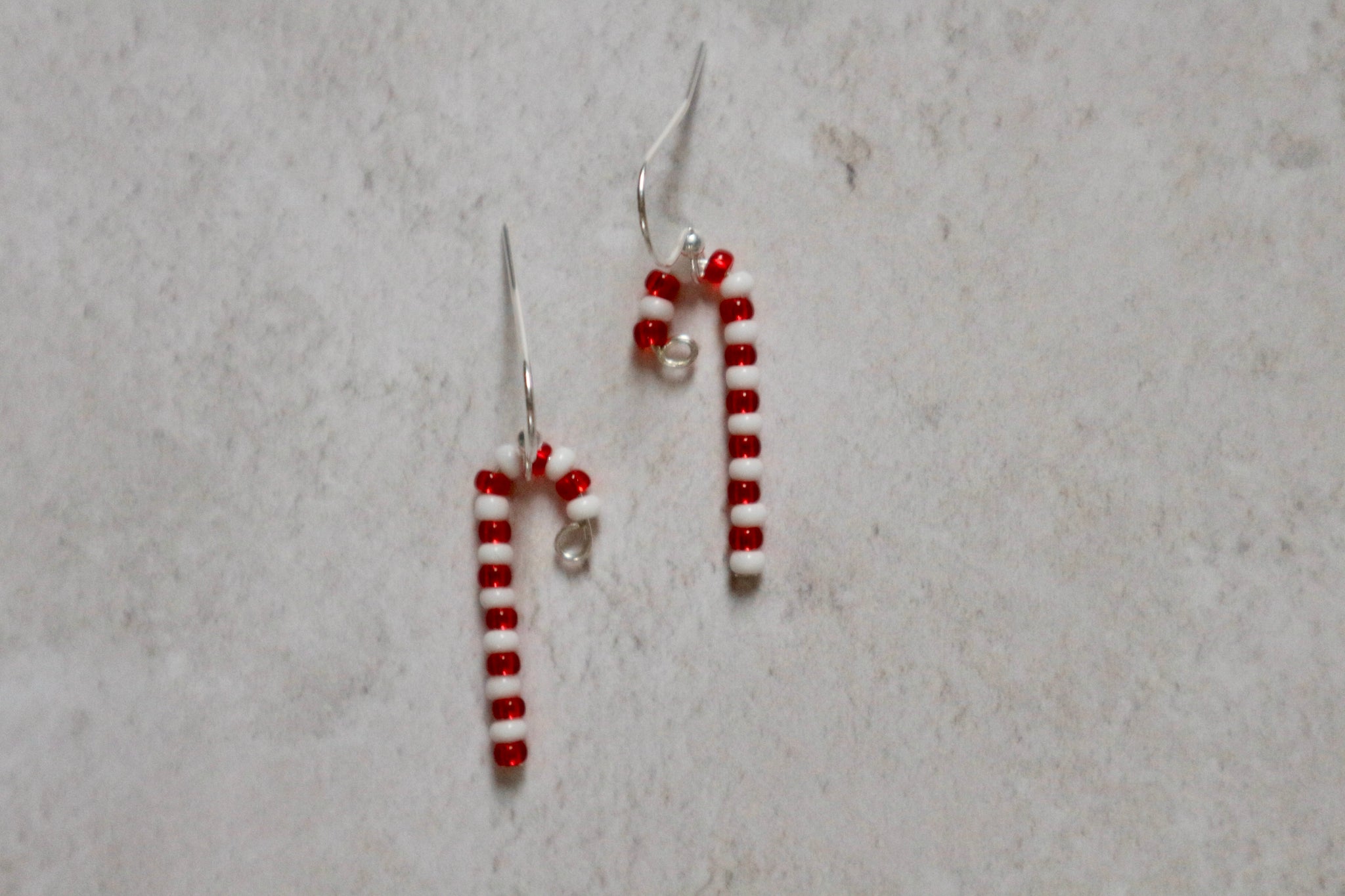 Small and adorable Candy Cane earrings. Made from glass seed beads in alternating colours of shiny red and matte white.